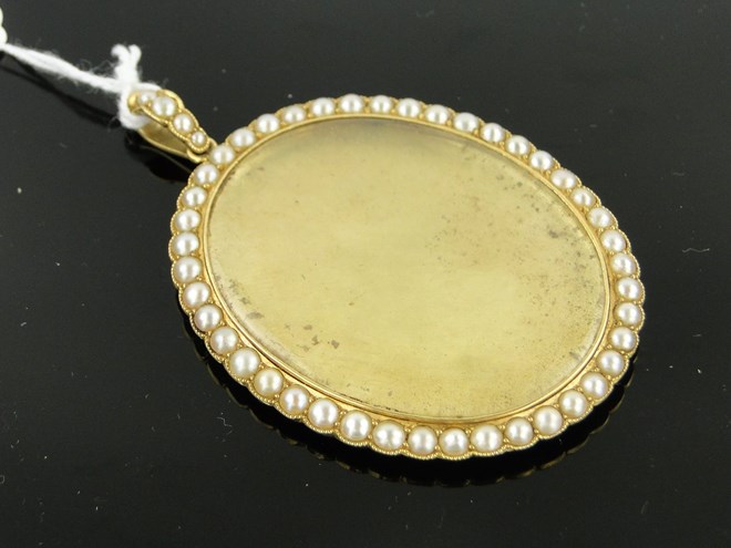 An 18ct gold photo pendant, with pearl set surround and pearl mounted bale, height excluding bale 52mm.