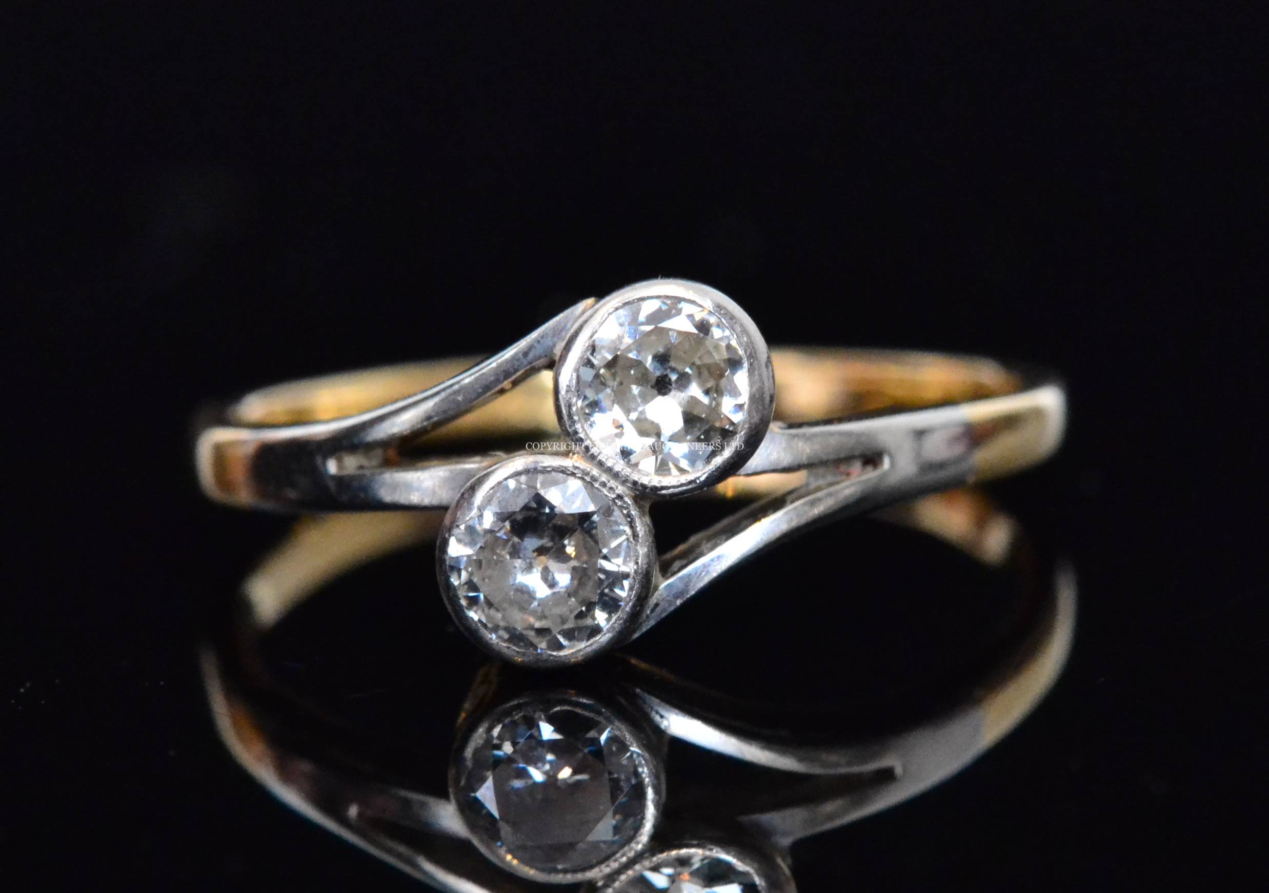 An 18ct two stone diamond ring, each brilliant cut diamond collar set to forked crossover setting, plain band, weight 2.6g, stamped, ring size N.