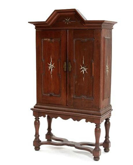 An 18th century Baroque oak cabinet, front with doors behind which shelves, drawers and compartment, inlaid with rosettes