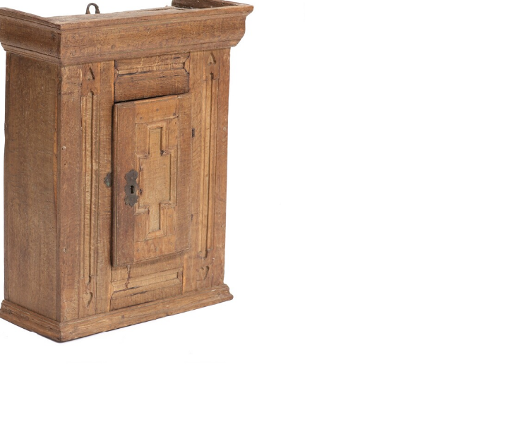 An 18th century Baroque wall mounted oak cabinet, profiled top, front with door