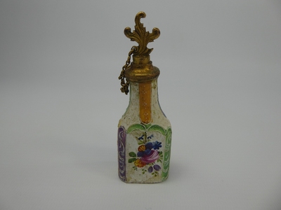 hand painted with floral spray and colourful panels, gilt metal stopper with chain