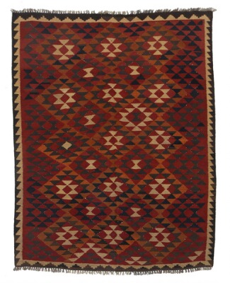 An Afghan Kilim rug, wool on wool, embellished with repeating pattern on reddish base. 20th-21st century. 198×157 cm.