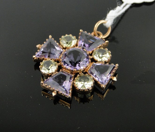 An amethyst and peridot set Maltese Cross design pendant, unmarked gold settings, width 25mm.