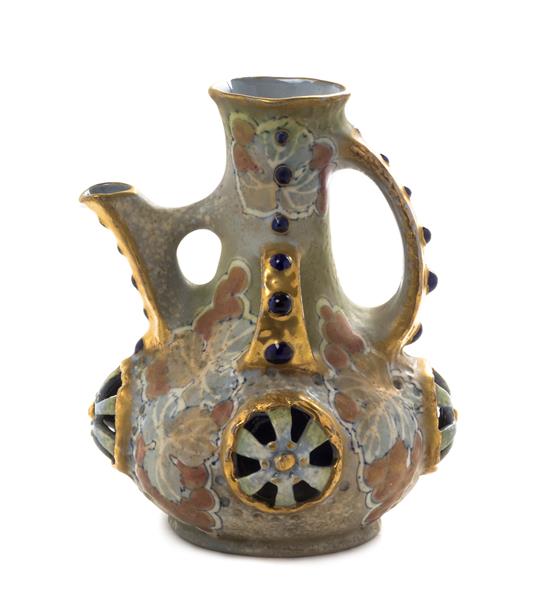 of bottle form with an applied spout and handles, having stylized foliate decoration and gilt highlights, with impressed oval AMPHORA mark, crown, numbered 11686-51.