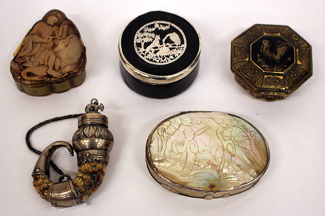AN ANTIQUE CYLINDRICAL TORTOISE SHELL AND SILVER MOUNTED SNUFF BOX, 6cm wide together with an Eastern mother of pearl and white metal snuff box, a hardstone mounted snuff box, two further snuff boxes (5)