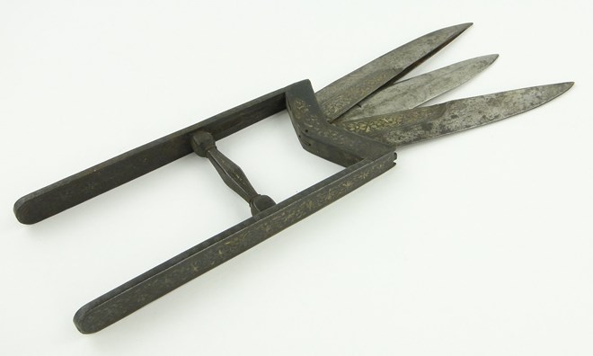 An Antique steel Qatar knife, with folding blade guards and Damascened decoration, length 15''.