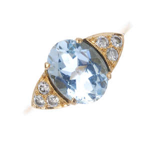 The oval-shape aquamarine, to the brilliant-cut diamond trefoil sides and plain band. Estimated total diamond weight 0.15ct. Ring size M 1/2. Weight 3.4gms.