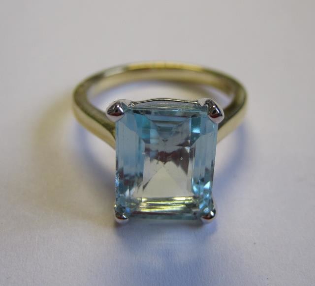 An Aquamarine Ring corner claw-set step-cut stone approx 4.40cts, in 18ct gold, ring size M
