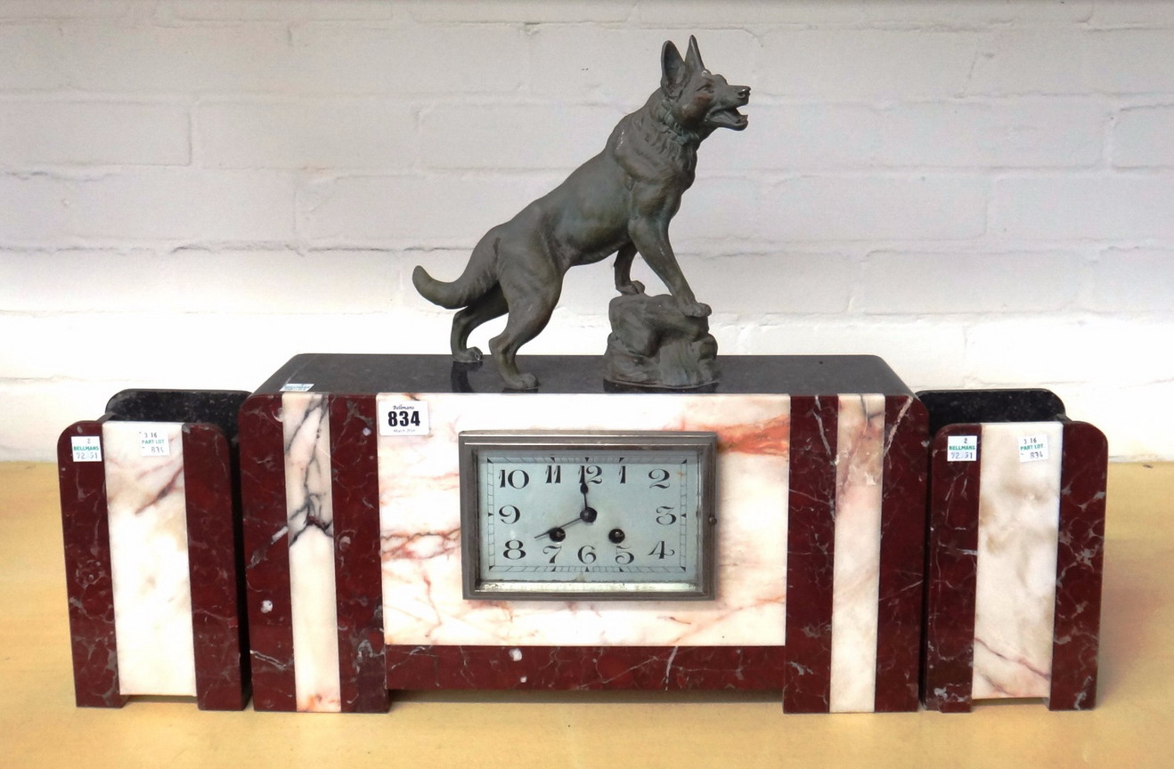 An Art Deco mantel clock garniture, with spelter alsatian over a marble clad rectangular case
