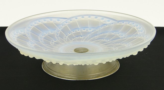 An Art Deco moulded glass comport on metal stand, stamped J Landier, France, diameter 13.75''.