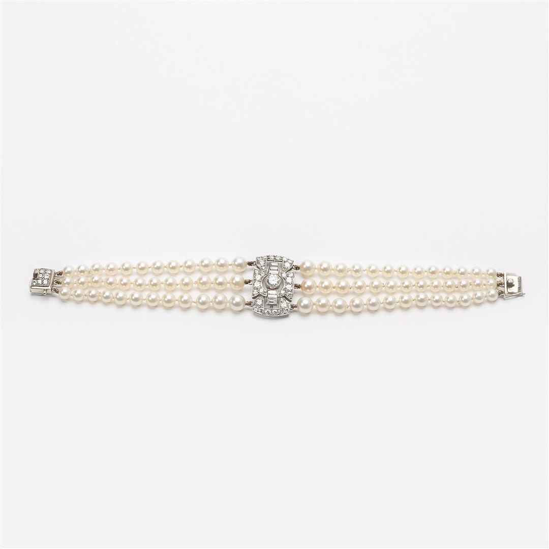 • An Art Deco platinum, 14 carat white gold, diamond and pearl bracelet