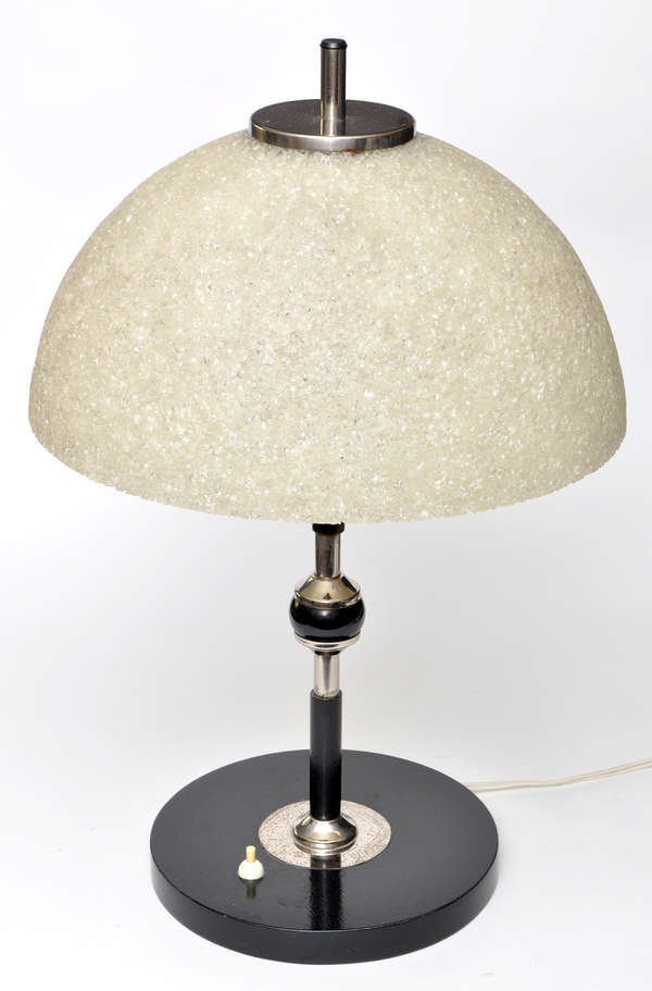 An Art Deco style table lamp, the crackle glass shade on ebonised and chromed stem, circular base