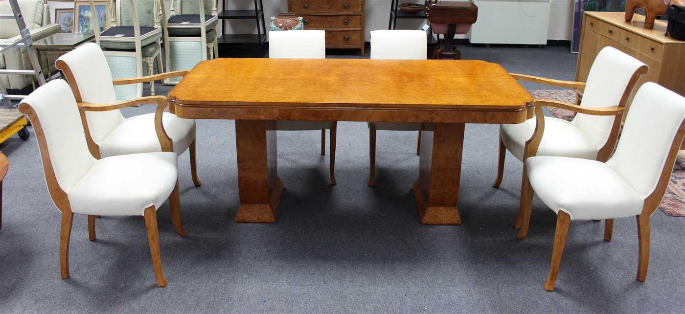 the maple and ash table raised on two pedestals, the four chairs and two carvers upholstered in cream fabric