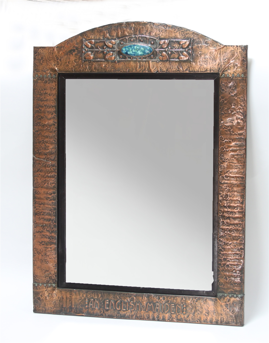 the arched top with oval blue enamel plaque to the centre and embossed 'An English Maiden' to the lower centre