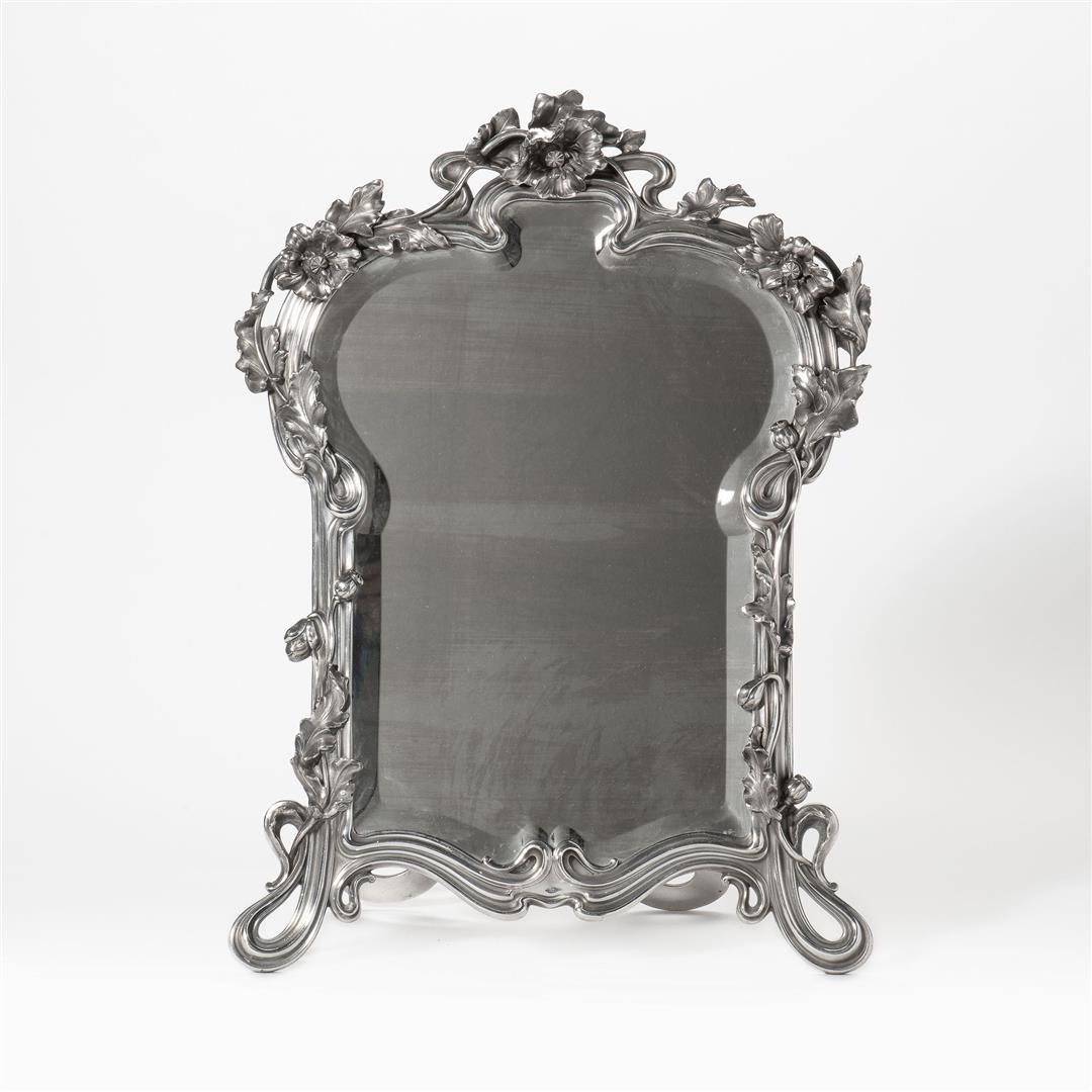 An Art Nouveau silver plated table mirror by Victor Saglier (1809 - 1894) for Louis Majorelle (1859 - 1926) France, circa 1900 A silver coated bronze framed beveled mirror with floral decorations on the frame, marked Victor Saglier, a sailboat with t