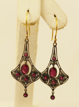 A PAIR OF FLAPPER STYLE RUBY AND DIAMOND GOLD COLOURED METAL DROP EARRINGS, each with six rubies and smaller diamonds, in a fanned setting with wires
