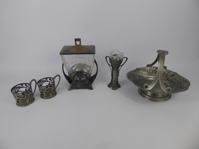An Art Nouveau WMF Wurttembergische Metallwarenfabrik Germany Pewter and Cut Glass Biscuit Barrel