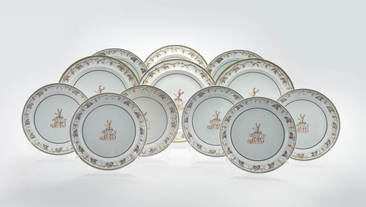 each centre decorated with a crest and initials, the rim painted in sepia with grapes and vine leaves, enclosed by dot, brown and gilt-line work, comprising: four Copeland & Garrett dinner plates, a Spode soup plate, six Spode Stone China side plates