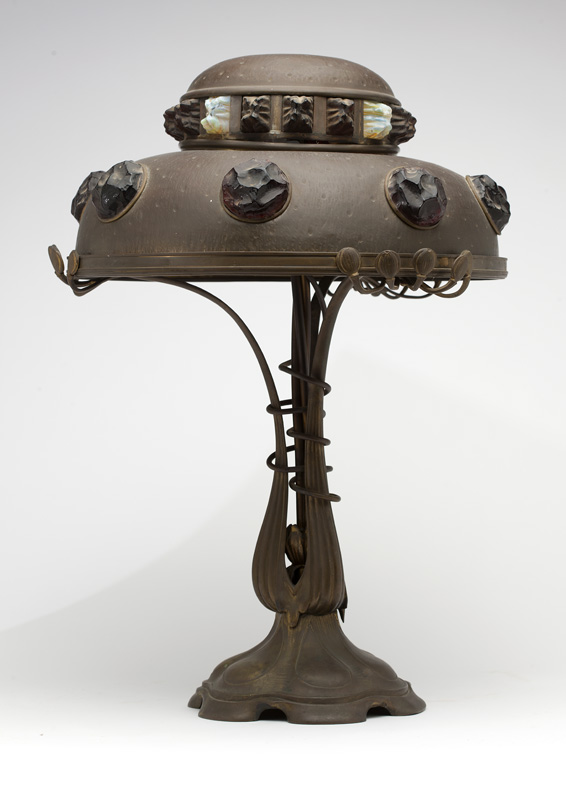 a patinated metal table lamp, the double-domed shade with inset rough ''jewels'' of semi-transparent red and white glass, raised on three foliate arms issuing from a lotus-centered base, on a shaped, organic foot