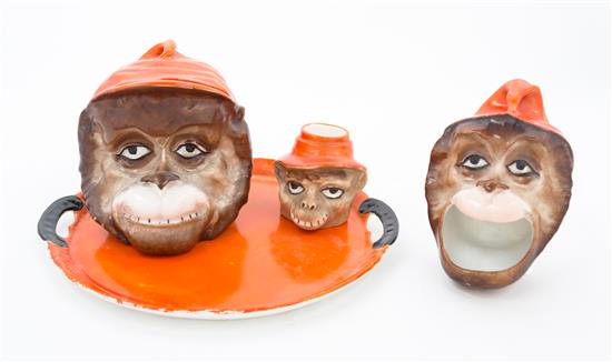 comprising a tray, tobacco jar, an ash receiver, and a match strike in a monkey motif