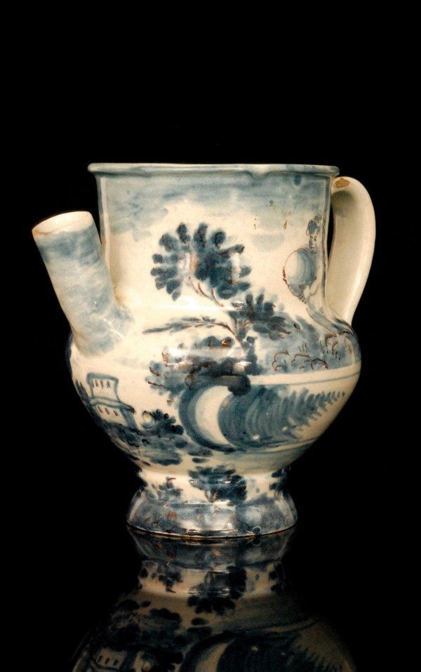 An early 18th Century Faience wet drug jar, Lombardi or Bassano, the pear body painted in blue and manganese with a cherub holding a mirror to one side and the reverse with a cherub holding a ribbon, all to a landscape setting with a castle beneath t