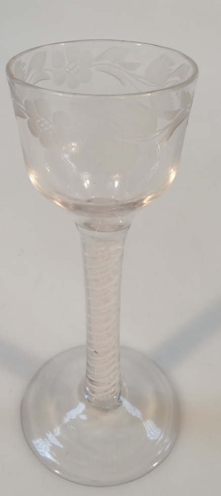 with circular bowl and double air twist stem on a conical foot with rough pontil, partially engraved with flowers, 15.5cm high.