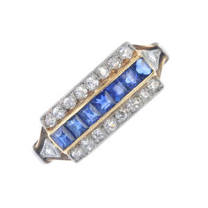 An early 20th century 18ct gold sapphire and diamond ring. The calibre-cut sapphire line, with single-cut diamond bar sides, to the similarly-cut diamond bi-colour sides and plain band. Estimated total diamond weight 0.20ct. Ring size M 1/2. Weight 2