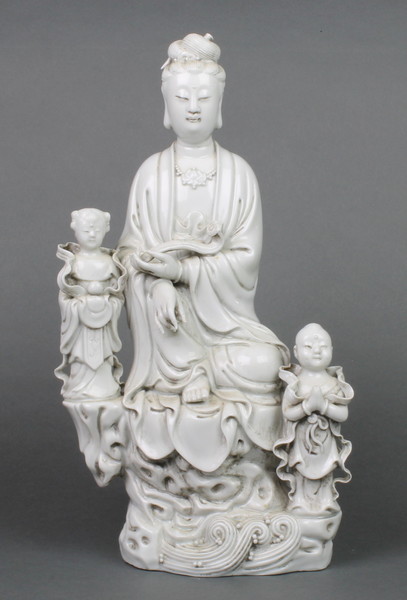 An early 20th Century blanc de chine figure of Guan Yin seated with 2 attendants on a raised base with impressed marks
