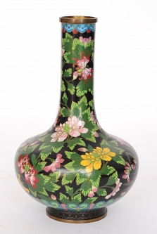 An early 20th Century Chinese Cloisonne ware vase of low shouldered form with tall collar neck decorated with flowers and foliage over a black ground, stamped China to the base, height 31cm.