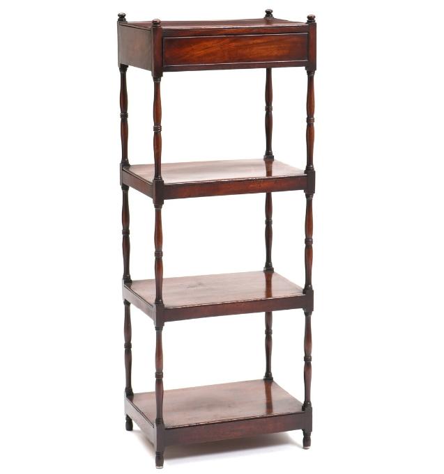 An early 20th century English mahogany étagère, top with drawer and three shelves