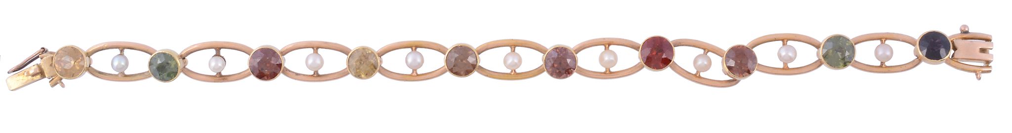 the pierced oval links each with a pearl highlight, with circular shaped gem stones between, including garnet, amethyst and various coloured zircons, the clasp stamped15ct, 20cm long