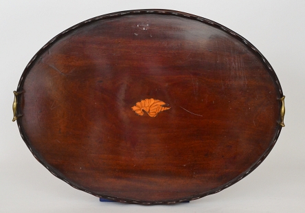 An early 20th Century mahogany oval tray with a scalloped border and twin brass handles, inlaid with central shell paterae, diameter 72cm across the handles.