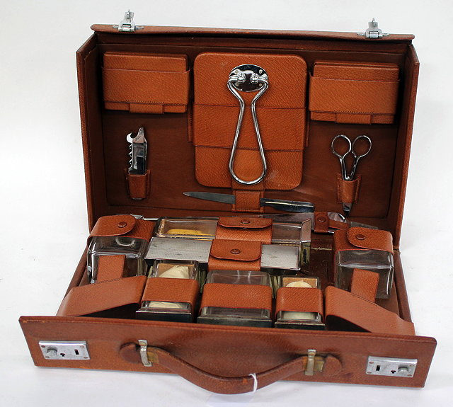 AN EARLY 20TH CENTURY SILVER MOUNTED VANITY SET to include cut glass bottles, a silver mounted brush etc all in a fitted leather case, 35cm wide