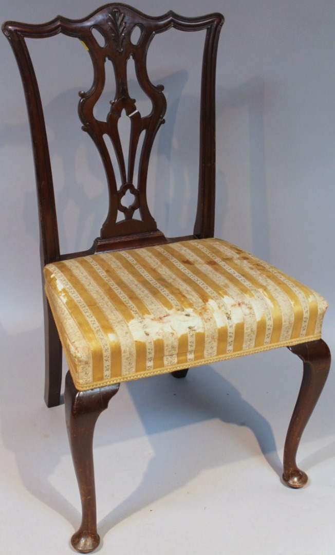 with a shaped top rail above a pierced floral back splat, with an overstuffed seat in Regency style gilt material on cabriole front club supports, 96cm high. (AF)