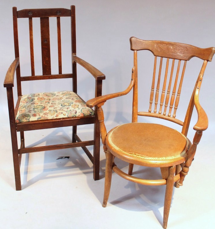 the plain splat carved with a central roundel with plain arm supports above a drop in seat, in (later) floral material on square front supports, 107cm high, and a stick back chair with overstuffed circular seat