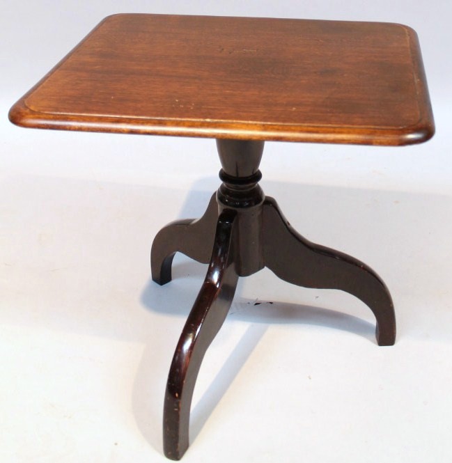 the oblong mahogany top raised on a baluster support terminating in triple shaped legs