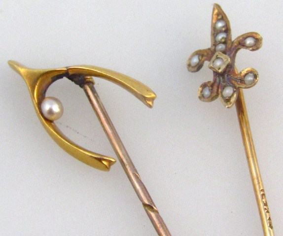 with a fleur de lis head set with small pearls, the plain stem marked 14k, 7cm high, 1g, and another with wishbone head marked 15c. (2)
