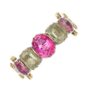 The alternating, graduated oval-shape foil-back pink topaz and cushion-shape foil-back chrysoberyl line, to the scrolling shoulders and tapered loop band. Ring size M. Weight 1.8gms.