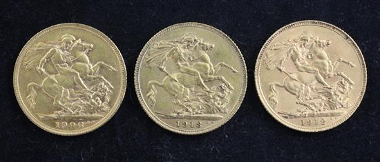 An Edward VII gold sovereign, 1906, good VF and two George V gold sovereigns, 1912 and 1913, both EF (3)