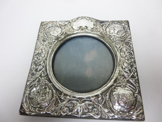 An Edward VII silver Photograph Frame embossed cherub masks etc, Birmingham 1906, 6 x 5 3/4in