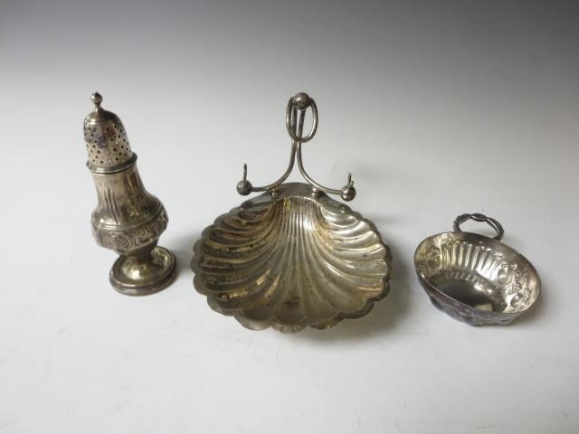 An Edward VII silver Shell Dish engraved initials, Chester 1907, small Georgian Caster, London 1797 and a Continental Wine Taster