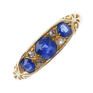 The graduated oval-shape sapphire line, with diamond point double spacers, to the palmette sides. Hallmarks for Birmingham, 1905. Ring size Q 1/2. Weight 4gms.