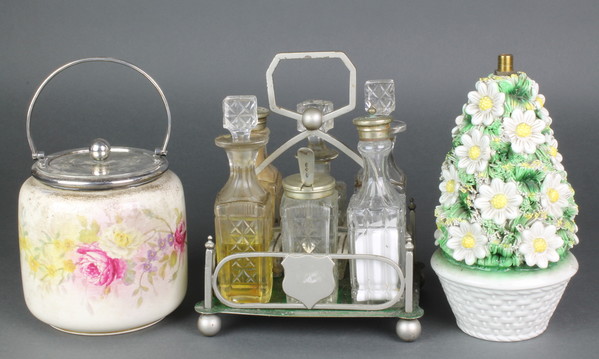 An Edwardian biscuit barrel with silver plated mounts, a 6 bottle cruet and a Continental porcelain table lamp base
