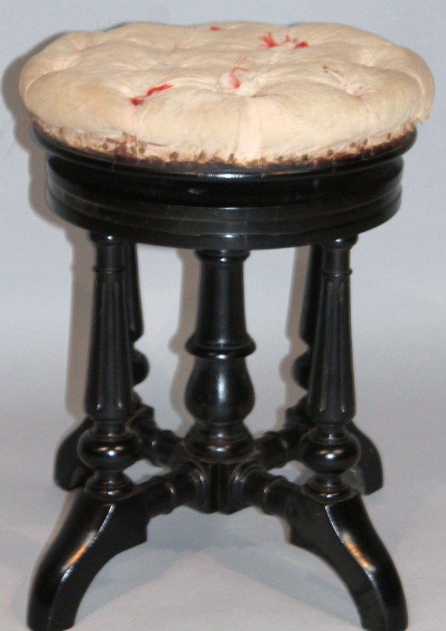 the circular overstuffed top raised on baluster fluted supports joined by cylindrical stretchers