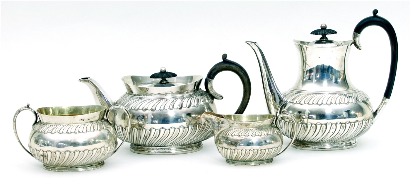 Sheffield 1901, of half lobed design, the tea and coffee pot each with ebony handle and finial, approximately 1500gm gross