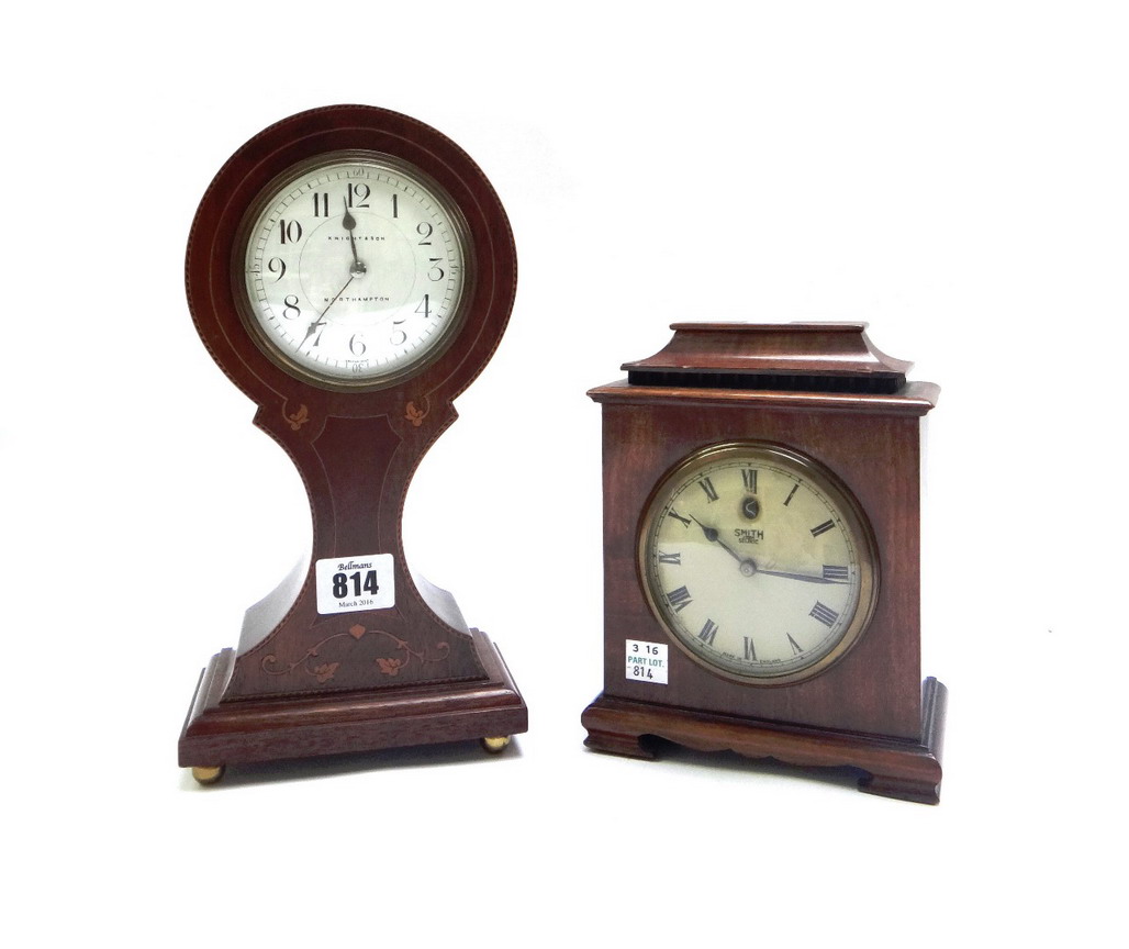 the white enamel dial detailed 'Knight and Son, Northampton', with a pinched waist and plinth base, on brass bun feet, 26.5cm high, and a Smiths mahogany cased electric mantel clock, 18cm high