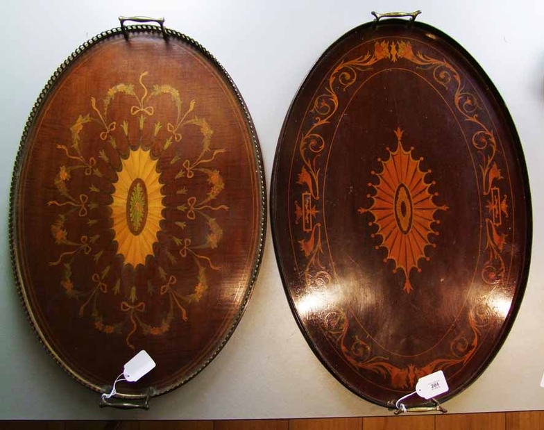 An Edwardian mahogany and inlaid oval tray, with twin brass handles and gallery
