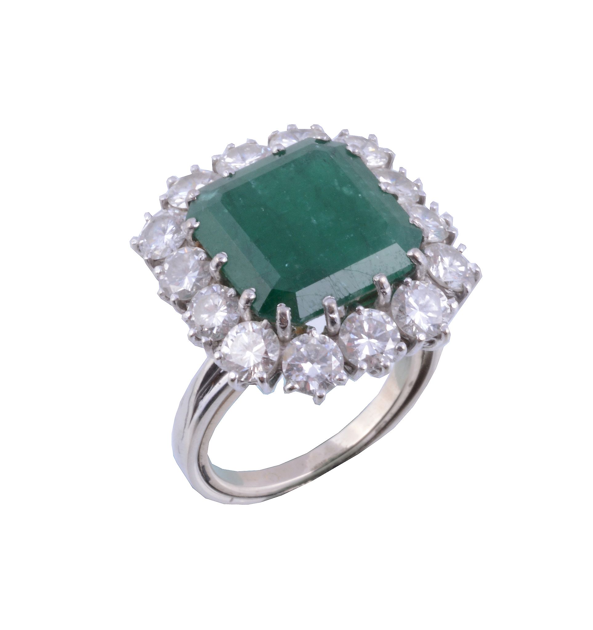 the central square shaped emerald claw set within a surround of brilliant cut diamonds, approximately 1.80 carats total, finger size I