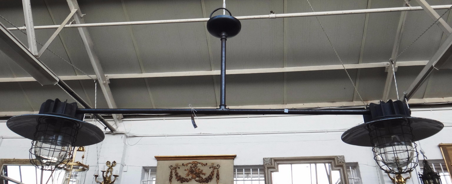 mid 20th century, comprising twin black and cream enamelled shades and glass fittings, within safety cages suspended from an iron bar and iron upright