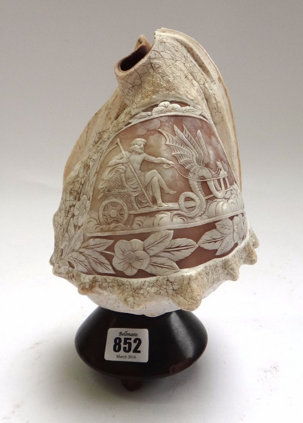 depicting a bearded figure riding a chariot throne led by winged serpents, mounted as a lamp